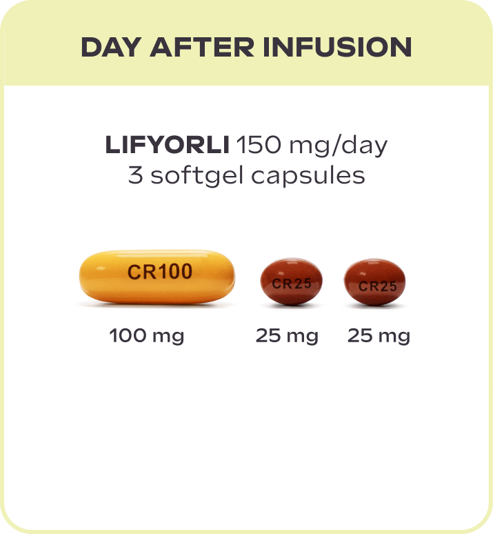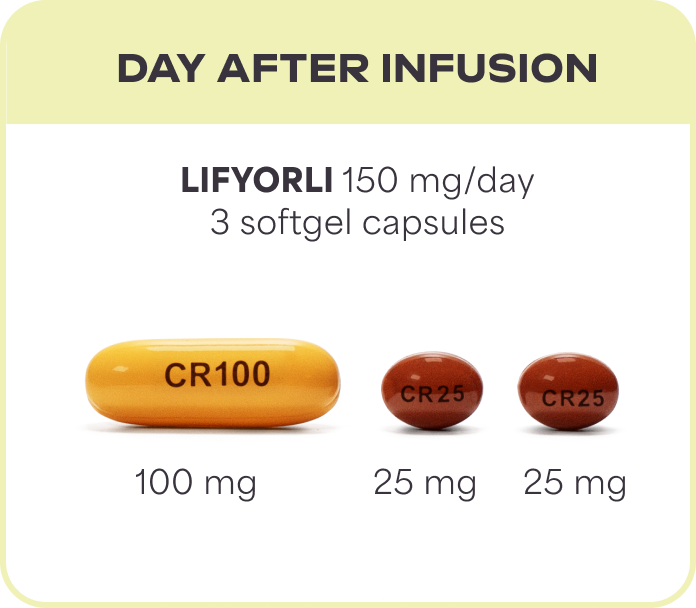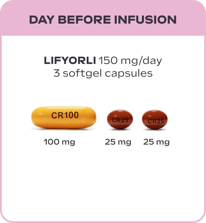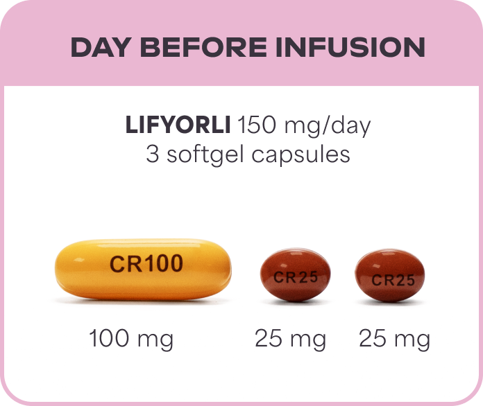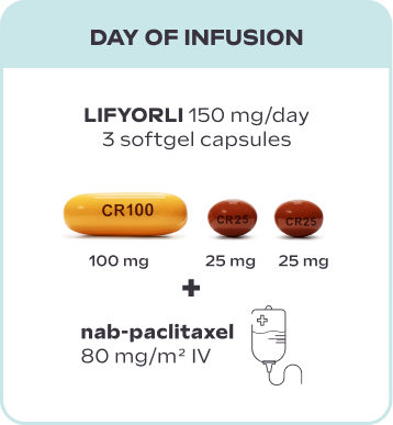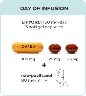 LIFYORLI is taken as three softgel capsules once a day on the day before, the day of, and the day after each nab-paclitaxel infusion. You can stay on this treatment schedule as long as you and your doctor feel it's right for you.