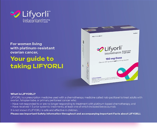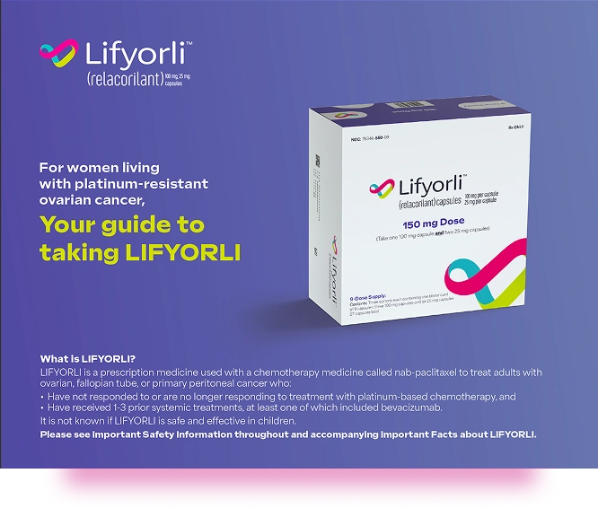 LIFYORLI is a prescription medicine used with a chemotherapy medicine called nab-paclitaxel to treat adults with ovarian, fallopian tube, or primary peritoneal cancer who: